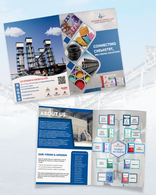 To create a cohesive and professional brand presentation through well-designed marketing and communication materials. The goal was to strengthen Jai Overseas Chemical’s visual identity and ensure consistency across print, exhibition, and corporate collaterals—reflecting the company’s credibility, quality, and technical expertise in the chemical industry.
